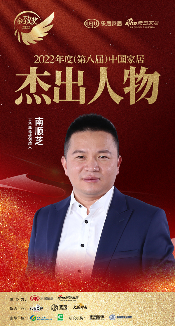 12月26日,由乐居家居主办,新浪家居承办,大国品牌、家页智库、大国中居联合主办的『趁势·再起——2022中国家居新时代盛典暨金致奖颁奖典礼』在云端盛大举行。在家居业界中首屈一指的年度盛会上,大角鹿创始人南顺芝荣获“2022中国家居杰出人物”,大角鹿荣获“2022消费者信赖十大家居品牌”。