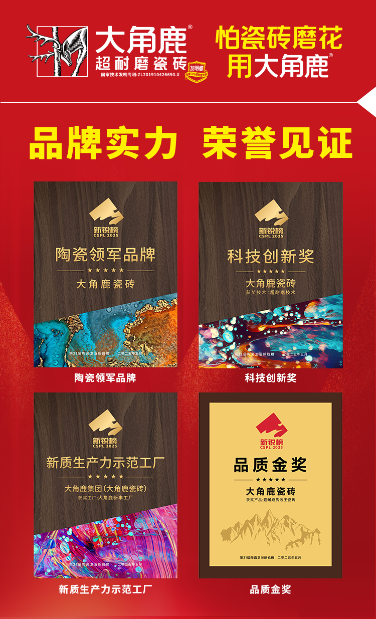 超耐磨大理石瓷砖发明者,大角鹿长期专注于超耐磨新材料领域研发,以技术为核心驱动力,持续推动产品性能升级。大角鹿自研的超耐磨钻石釉技术,使瓷砖耐磨度达到4级以上,是普通瓷砖的3倍,解决了瓷砖易刮花、不耐磨等使用痛点,引领行业进入“超耐磨”时代,定义了高品质瓷砖的核心价值。天九国际娱乐网站网址查询 耐磨技术取得多项国家发明专利,并获得了德国莱茵TÜV超耐磨认证及美国、欧盟超耐磨发明专利,确立了大角鹿在全球超耐磨瓷砖领域的技术领先地位。