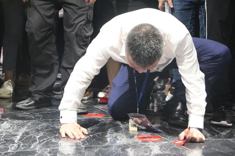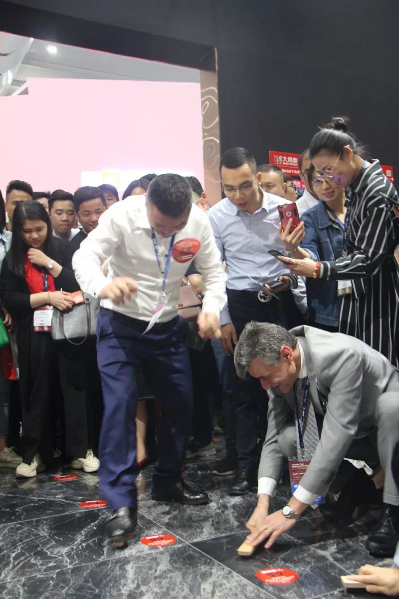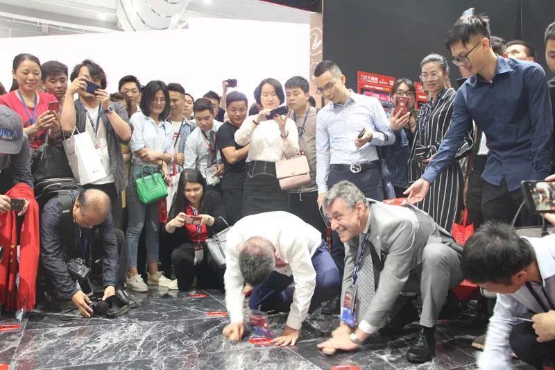 不一会儿,人称“疯狂的石头人”的大角鹿董事长南顺芝也来了,现场工作人员为他腾出一小块地方,他和意大利卡罗比亚釉料公司代表Nazzario Di Mauro一起蹲在地上,一声“开始”后,两人拼命磨擦瓷砖。